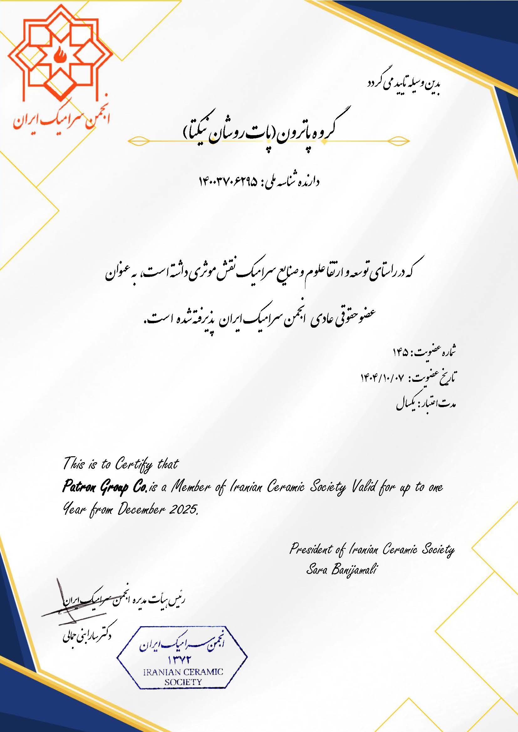 گروه پاترون عضو انجمن های علمی و تخصصی مختلفی است که گواهی عضویت آنها در زیر آمده است: